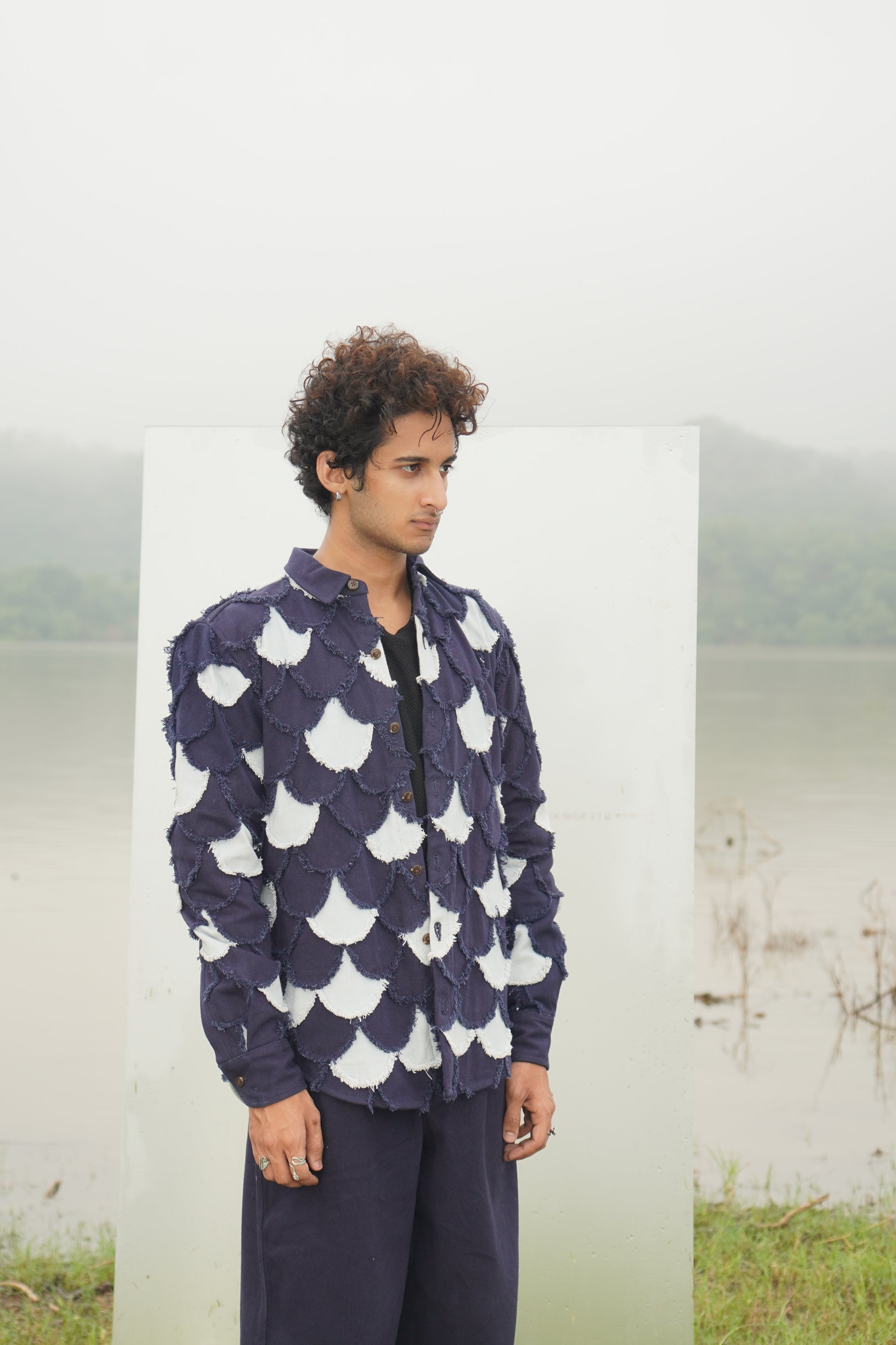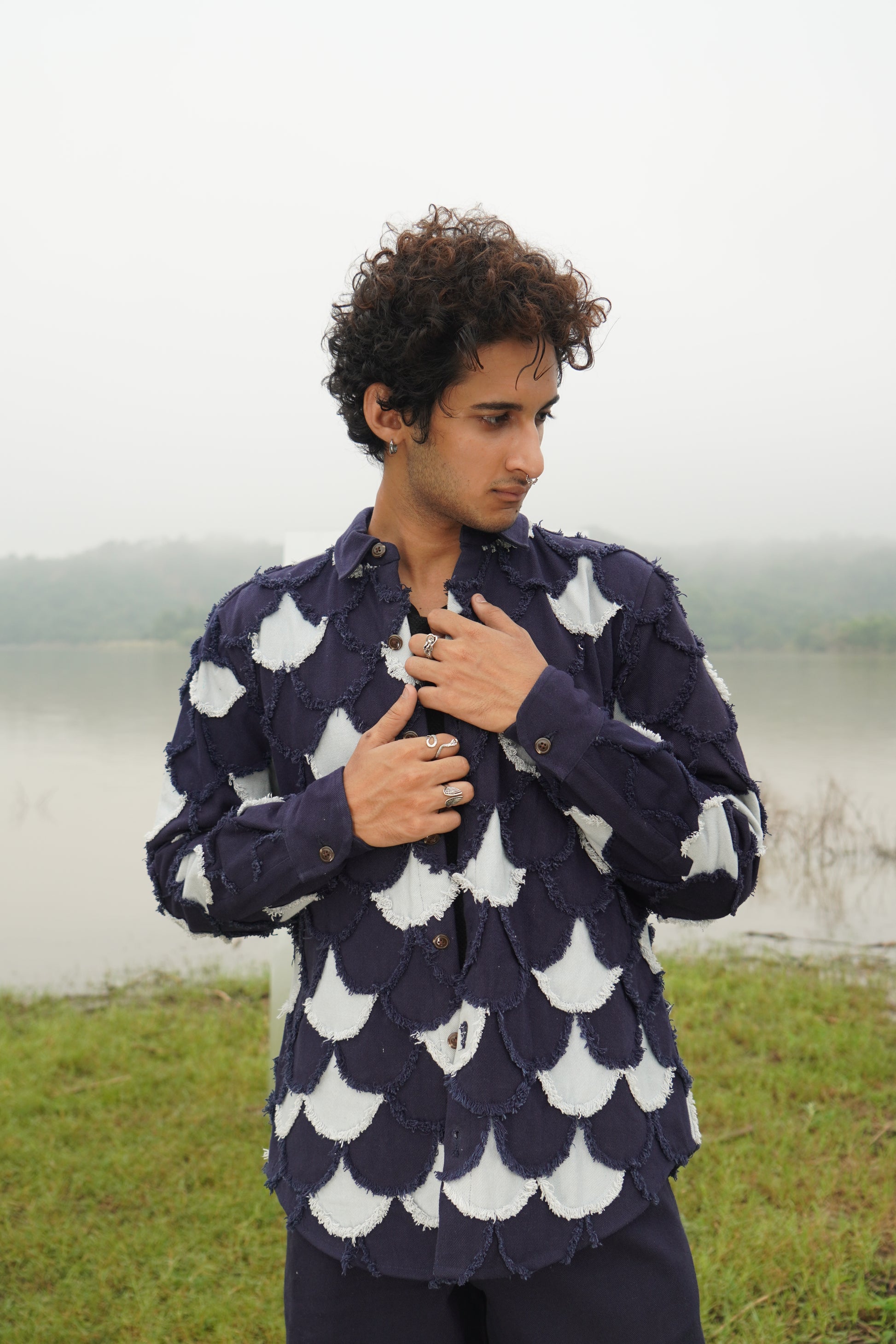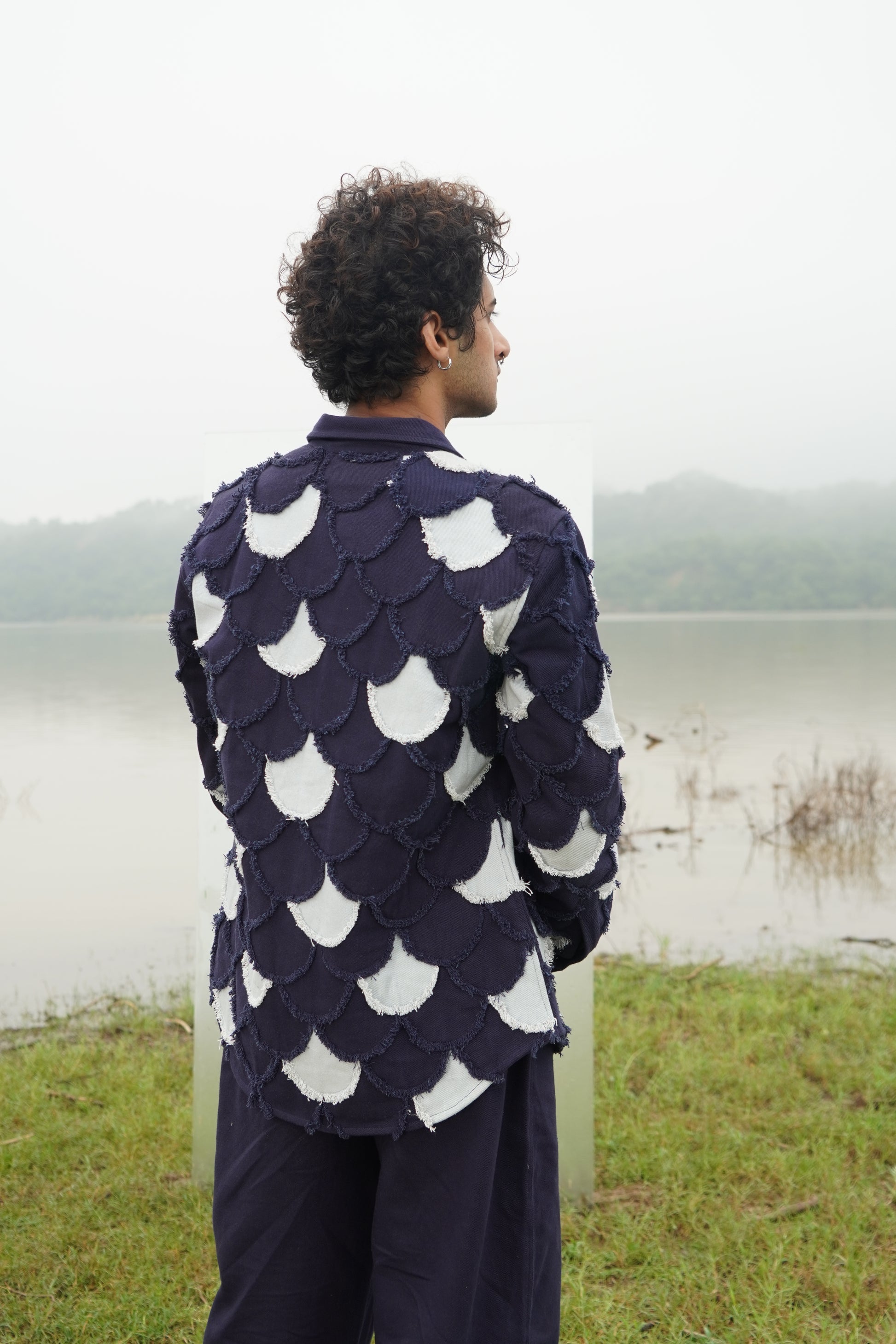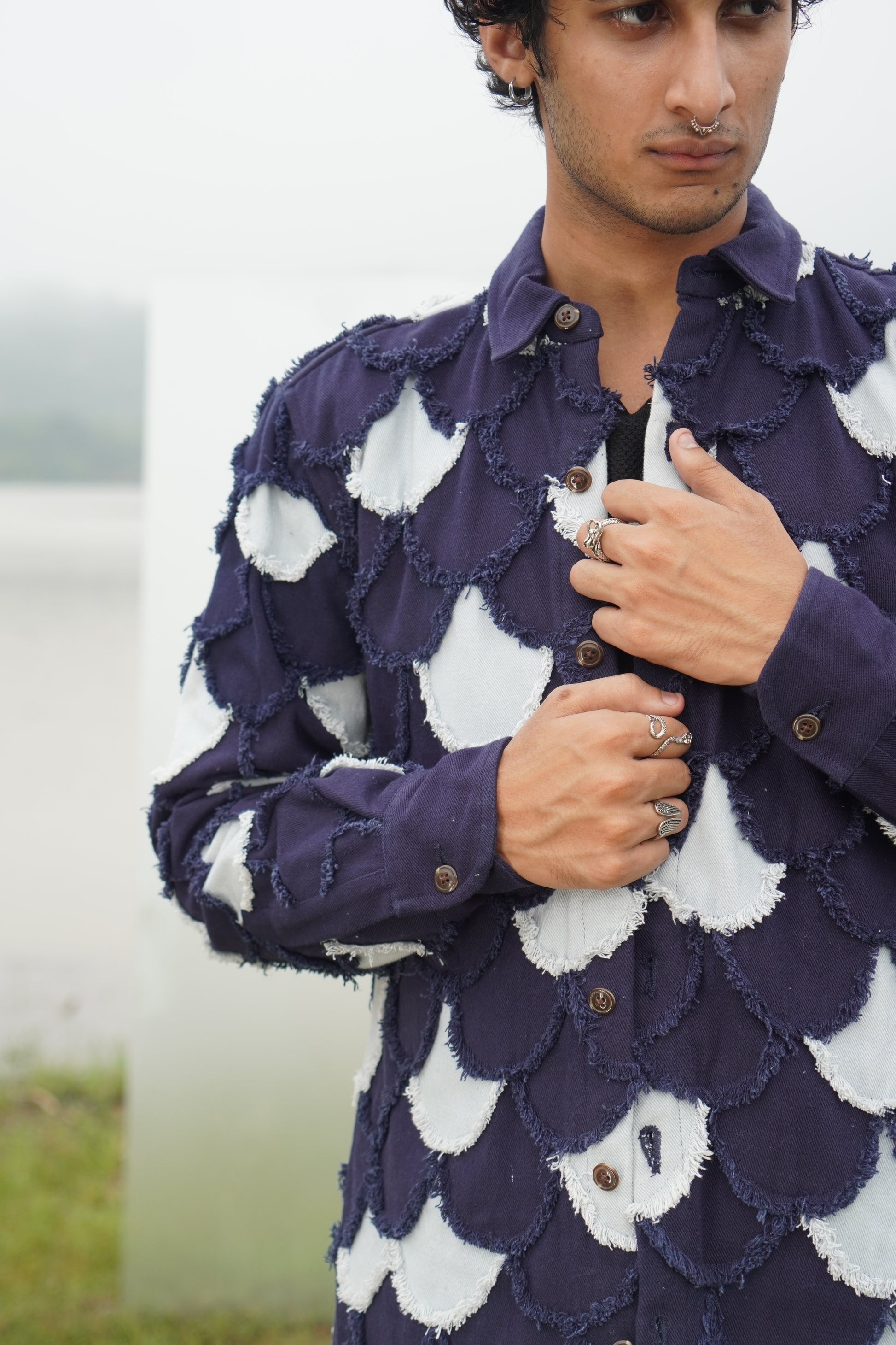 The Arden Jacket is a bold fusion of artistry and modern design, featuring a unique scalloped patchwork pattern each patch is been trimed and eyelash fringes detailing is been done with high precision in shades of navy blue and light blue. This unisex jacket draws inspiration from the timeless elegance of scalloped edges, a design that has graced architecture, fashion, and art for centuries. The smooth flow of the scalloped design evokes a sense of rhythm and balance, seamlessly merging the two contrasting blues into a visually striking piece.