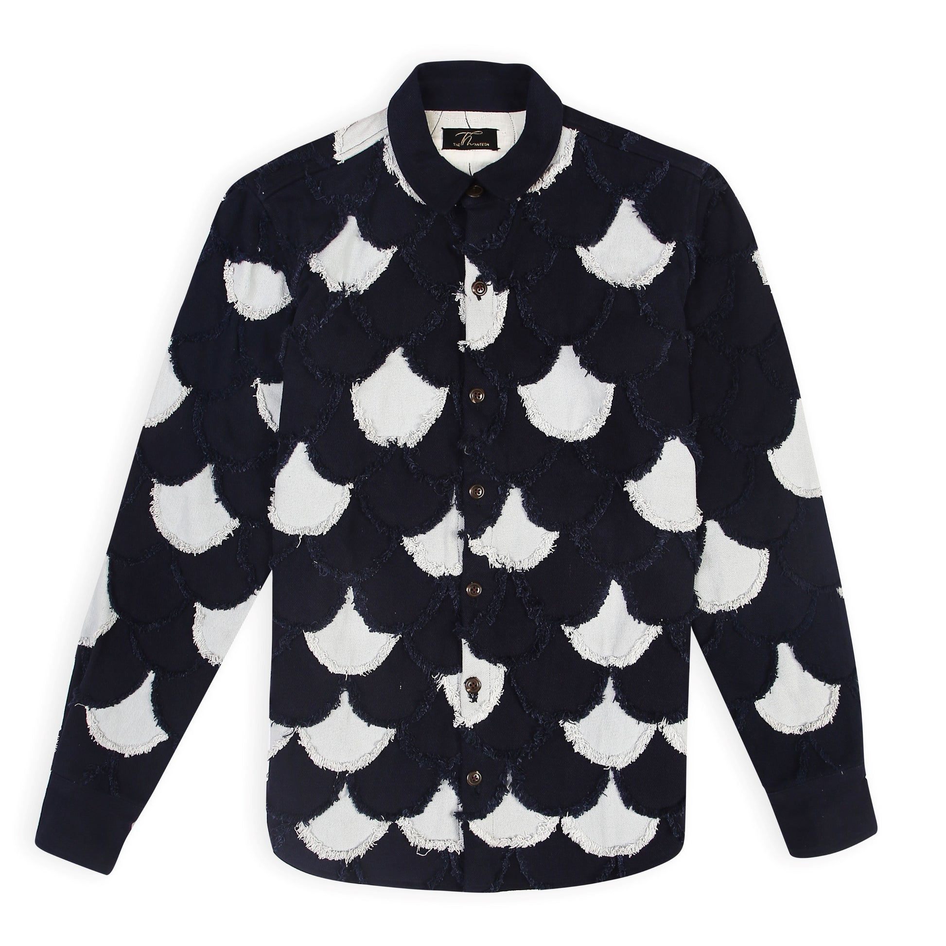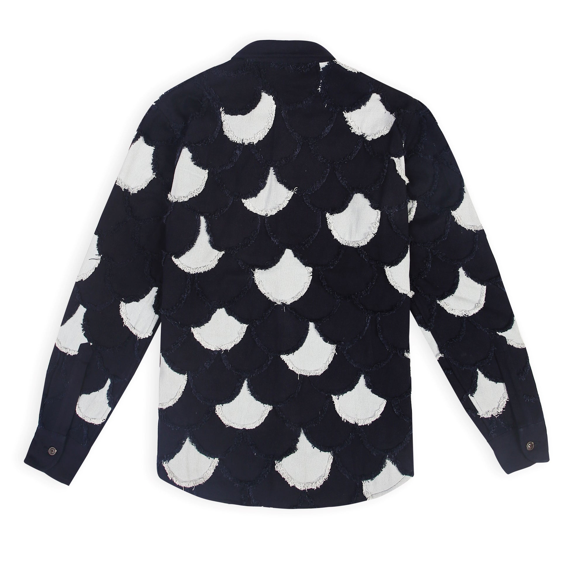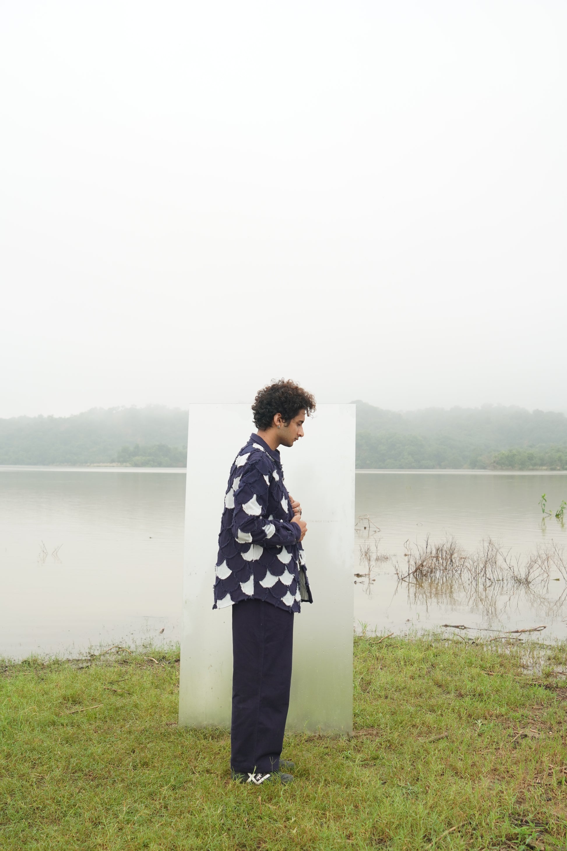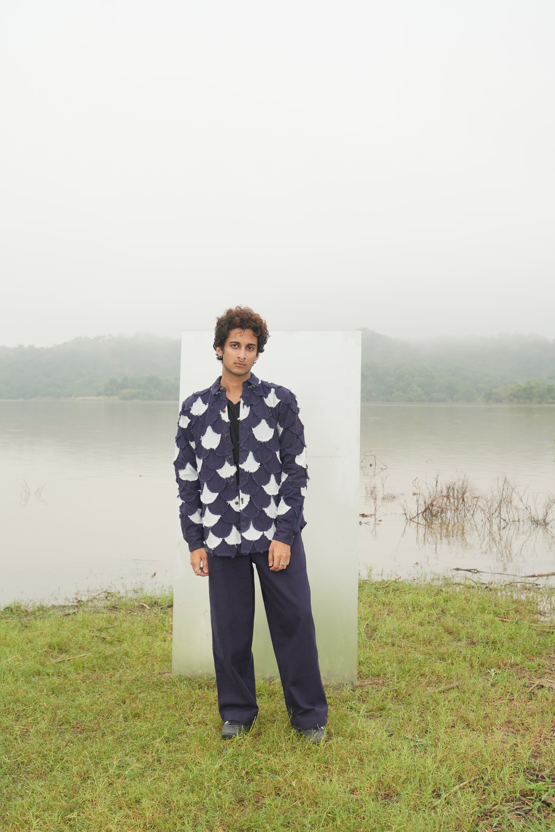 The Arden Jacket is a bold fusion of artistry and modern design, featuring a unique scalloped patchwork pattern each patch is been trimed and eyelash fringes detailing is been done with high precision in shades of navy blue and light blue. This unisex jacket draws inspiration from the timeless elegance of scalloped edges, a design that has graced architecture, fashion, and art for centuries. The smooth flow of the scalloped design evokes a sense of rhythm and balance, seamlessly merging the two contrasting blues into a visually striking piece.