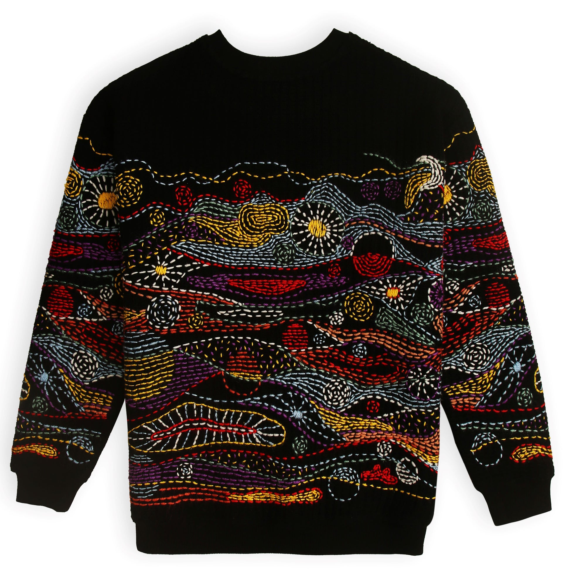 The design is inspired by the idea of movement and connection — how lines travel, overlap, and form new shapes. The embroidery reflects natural rhythms such as waves, pathways, and shifting landscapes, translated into layered, free-flowing stitchwork. Every piece carries the artisan’s interpretation of these fluid patterns, making each sweatshirt truly one-of-a-kind.